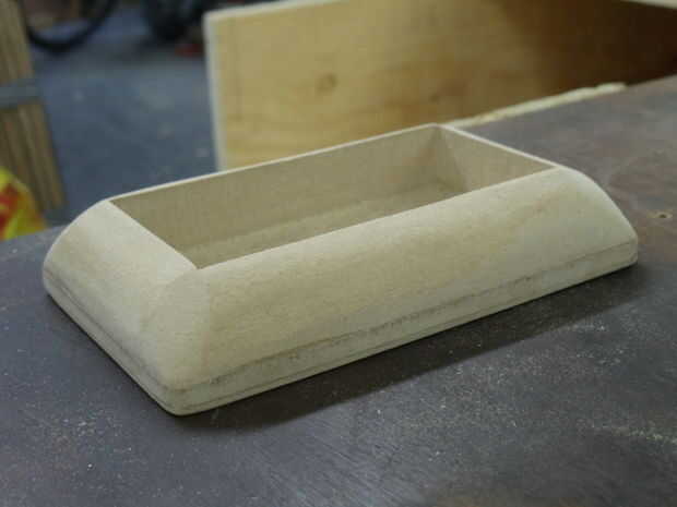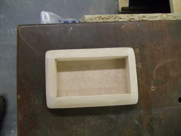 Usando una de MDF de 80x125x12mm corta estas dos formas de 'L' y colocarlos juntos para crear el rectángulo. Ahora poner la carcasa de la radio en este rectángulo y ajustar hasta que no haya ningún espacio claro entre la radio y la base. Sacar la cáscara de la radio y pegar los dos ' L junto a los otros 125x80x12mm. Cuando esté seco, mano arena el rectángulo para crear el borde curvado derecho el camino alrededor de la base.