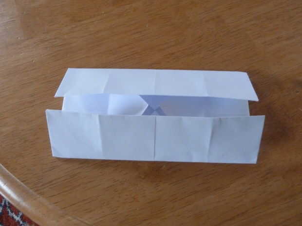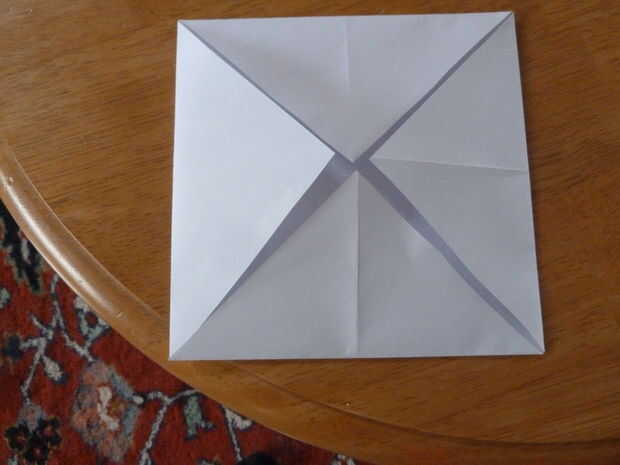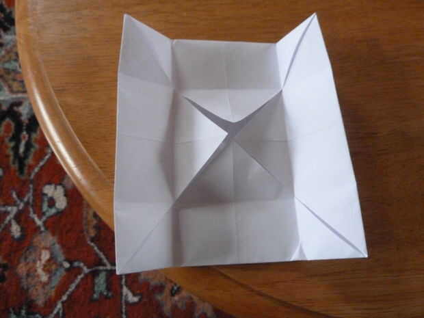 Doblar los vértices hacia adentro al centro del papel. A continuación doblar los bordes del papel hasta donde los vértices dobla hacia adentro en la dirección anterior. Ahora se despliegan lo acaba doblado como se muestra. Girar el papel 90 grados y doblar los bordes del papel hasta donde los vértices dobla hacia adentro en la dirección anterior. Ahora se despliegan lo acaba doblado como se muestra (otra vez).