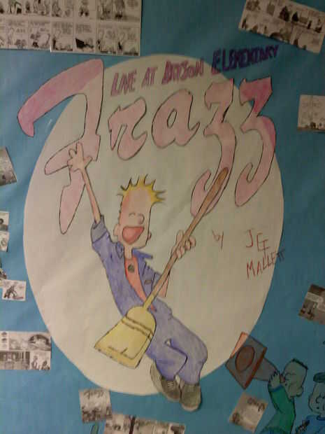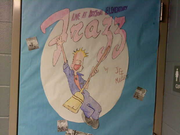 Mi novia trabaja en una escuela primaria como custodio y marzo es el mes nacional de lectura para que los maestros tenían sus estudiantes decorar puertas como portadas de libros. No a dejar a mi novia deseada decorar su puerta del armario del conserje para parecerse a un libro. Pero lo del libro??? bueno ella es un custodio... es una escuela de primaria... que es de todos conserje de escuela primaria favorito??? Frazz por Jef Mallett por supuesto así que decoramos la puerta de su armario para representar "Frazz vivo en Bryson elemental" por Jef Mallett.