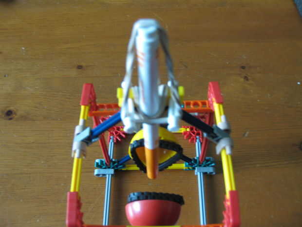 Configurar el pen entre las dos varillas blanco pequeño y estirar un elástico (puede necesitar ser duplicado en) alrededor del lado de la pluma y gancho en los extremos más pequeños de las barras de blanco detrás del conjunto amarillo. Ahora uso otro elástico para estirar en la parte superior de la pluma y alrededor de las barras de blanco, con el fin de mantener firme presión hacia abajo sobre la pluma.
