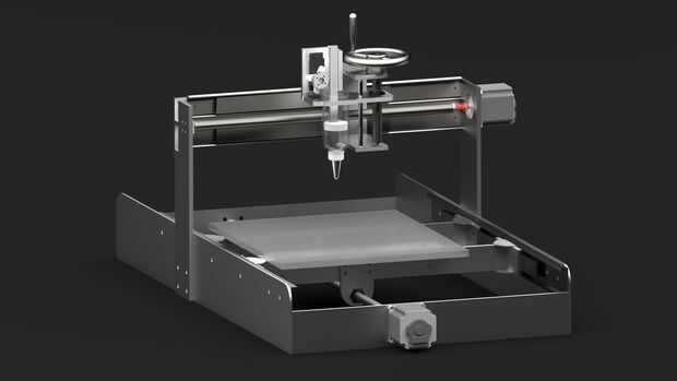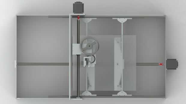 La placa de acrílico que tiene la torta está fijada a una tuerca que se monta en la varilla roscada del eje x; el mecanismo de dispensación se mueve en el eje y. Estos dos ejes también se controlan con los interruptores de límite, que comprenden el mecanismo de puesta a cero. También existe un eje z manual que mueve el mecanismo dosificador para ajustar la altura de la torta.