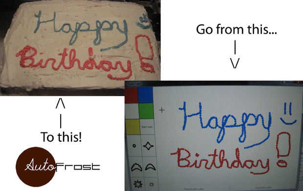 Los usuarios diseñar pasteles en una pintura gráfica de usuario interfaz (GUI) y AutoFrost convierte en realidad. Hemos escrito nuestra GUI usando Python y Tkinter. Aspirantes a decoradores de pasteles pueden controlar colores y formas de boquilla mientras la elaboración de la torta de sus sueños. Como los usuarios dibujan, recogemos puntos en intervalos iguales de tiempo y almacenar su ubicación, color y forma. Luego analizar por forma color y boquilla (preguntar al usuario cada vez que un cambio es necesario) y enviar a distancia x y distancia y helar o no comandos a nuestros tres motores.