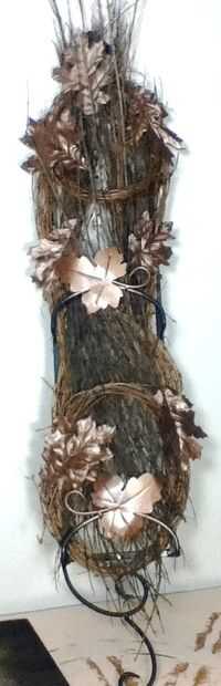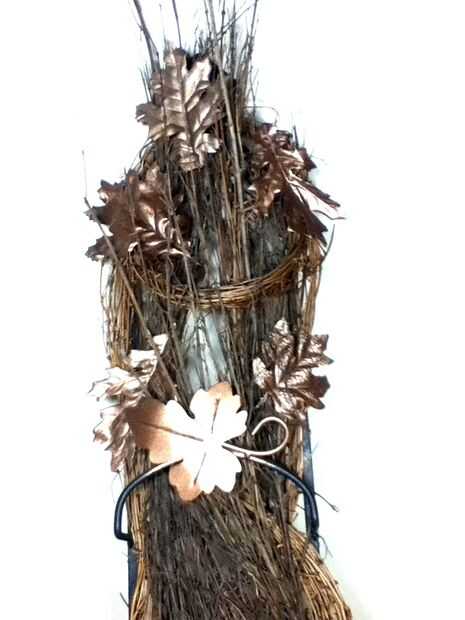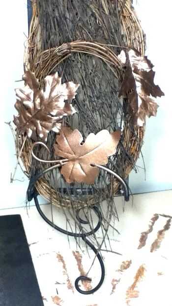 Usando una pistola de pegamento caliente de baja temperatura, pegamento en las hojas bronceadas para ocultar dónde están tus lazos de alambre floral. Batido de hierro forjado de diseño para asegurarse de que sale y pega estancia unida al diseño.
