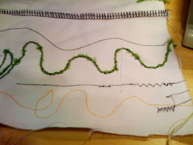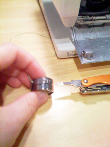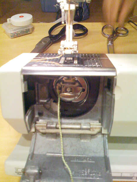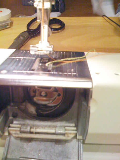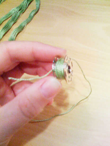 Coloque la canilla en el rastro de la bobina y asegúrese de que se saque el hilo dental a través de la forma habitual. Poner la huella de la bobina en la máquina y hacer una costura a mano para subir el hilo a través de la placa base de la forma habitual. Afloje la tensión del hilo superior un poco, a sobre el nivel de un ojal. No desea que la seda del bordado tirada para arriba a través de la tela en todo, pero también no quiere lazos sueltos del hilo de la aguja colgando hacia abajo.