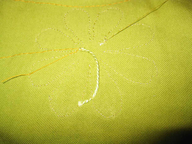 Coser en el interior de los pantalones, siguiendo el patrón que dibujó tan de cerca o no cerca como quieras. En cualquier extremos que no funcionan con un borde, tire del hilo de bordado a través de la tela y amarra con el hilo de la bobina en el interior.