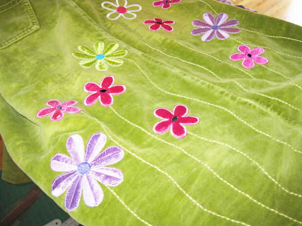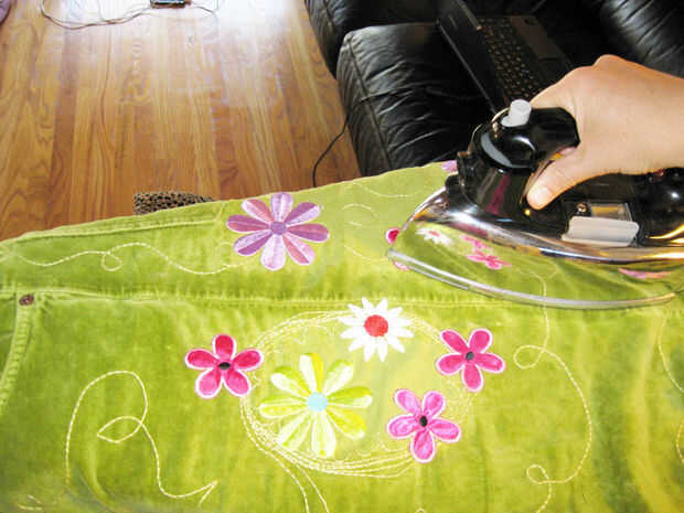 Mis pantalones son terciopelo, que hace muy bien el pegamento no palo. Elegí a Pespuntear mi apliques después de planchar, por seguridad.