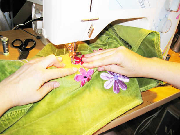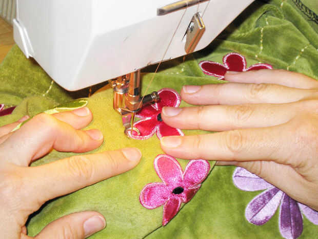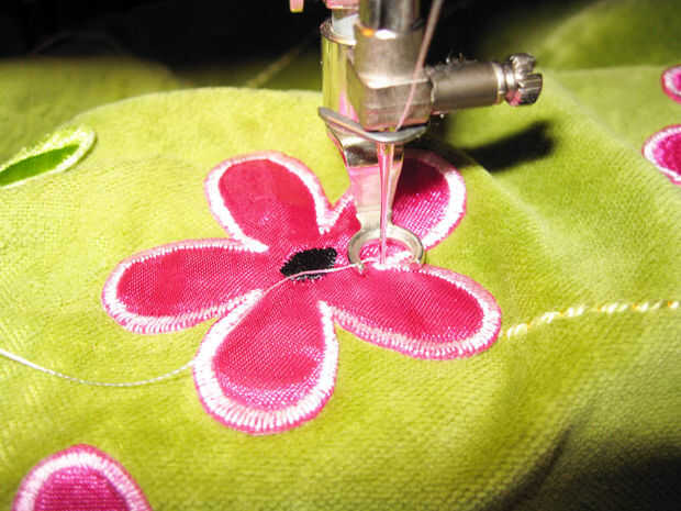 Este tipo de bordado de la máquina, donde estoy haciendo formas curvas muy pequeñas (pétalos), me parece más fácil al caer los alimentadores de la máquina y usando un bordado pie. Caer los dientes de transporte hace que la máquina no intente tirar de la tela debajo del prensatelas en línea recta, como es normal. Esto significa que puede mover a la tela que está cosiendo en cualquier dirección con facilidad. El inconveniente es que tienes que hacer todo el trabajo de moverlo. Esto es también por qué quieres un pie de bordado, que tiene un resorte en él para no bajar tan duro como un pie normal. Incluso con los alimentadores hacia abajo, es difícil mover la tela a través de la máquina si el pie regular está en el lugar.