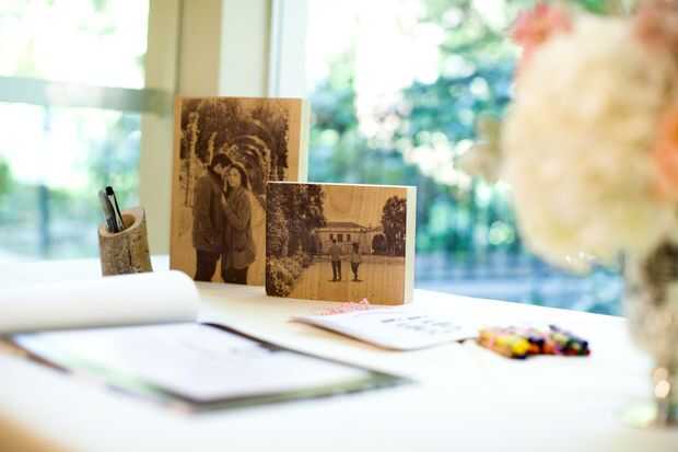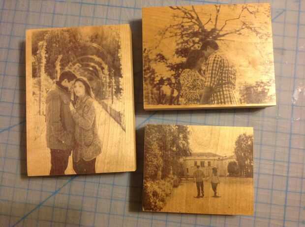 Pueden presentar sus fotos de compromiso en su boda en madera! Esto puede requerir alguna edición de fotos y estas salen mejor en negro y blanco pero usted puede hacer varios de estos en minutos. Intenta no usar imágenes pequeñas y asegúrese de que usted zoom a las caras porque se convierten en difíciles de ver. Usar la misma técnica de transferencia de imagen del chorro de tinta como las invitaciones, pero quizás tenga que ajustar la configuración de la impresora y la imagen porque si no tiene cuidado es fácil de manchar y desenfoque de la imagen. Tómese su tiempo con esto. He utilizado madera de abedul gruesos de 2 pulgadas por el grano claro limpio. Lijar la madera con papel de grano arena 220 para una superficie plana y luego asegúrese de que no es ninguna ruina. Imprimir su imagen en el papel de transferencia y recuerde que usted necesita invertir la imagen, especialmente si hay alguna palabra. Un lado cinta de la transferencia de papel al lado de la madera con cinta de pintor azul y transferir cuidadosamente la imagen. Otra vez es fácil de difuminar la imagen así que Tómese su tiempo y tenga cuidado. Existen otras técnicas de transferencia de madera como el uso de modpodge, pero no son tan rápido o tan clara como esta. Si desordenar, puede lijar la madera clara y empezar de nuevo pero es muy lento si no tienes las herramientas. Cuando haya terminado, selle la imagen con goma laca y madera acero.