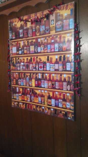 Mi cocina fue adornado con chiles de todas cosas. Incluyendo Chile cortinas impresas que había hecho a la medida de mi cocina ventanas y la puerta de atrás. Recientemente una de las cortinas tiene ripeada de alguna manera y mi novio cambió las cortinas. Sin embargo todavía se puede ver la idea que estoy tratando de compartir en la imagen.