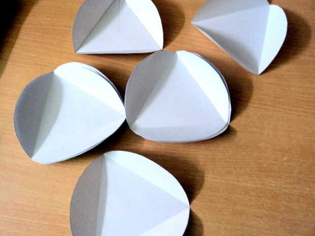 Después de hacer los triángulos doblan los lados de los círculos de dentro a lo largo de los lados de los triángulos como se muestra en las fotos.