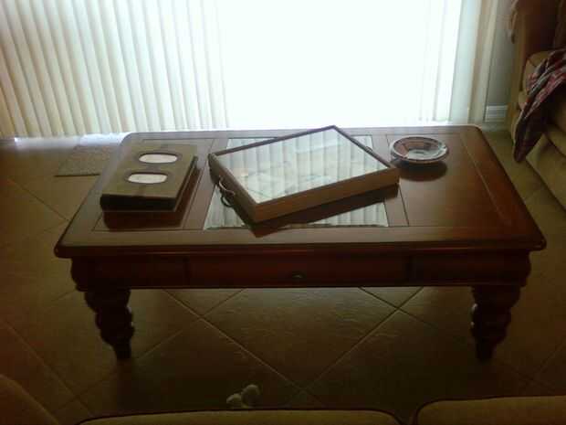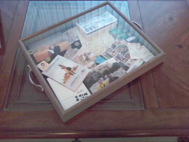 Coloque la espalda en el shadowbox. Asegure la parte posterior en el. Con el destornillador, quite cualquier hardware conectado para colgar que puede rayar la superficie, en que coloque la bandeja. A continuación, pelar y pegar el fieltro en las esquinas del shadowbox. Esto es para que pueda sentarse en cualquier superficie sin dañarla. Ahora ponlo hacia abajo y disfrute de su creación.  También puede establecer bebidas o bocadillos que servir a tus invitados y estimular temas de conversación.