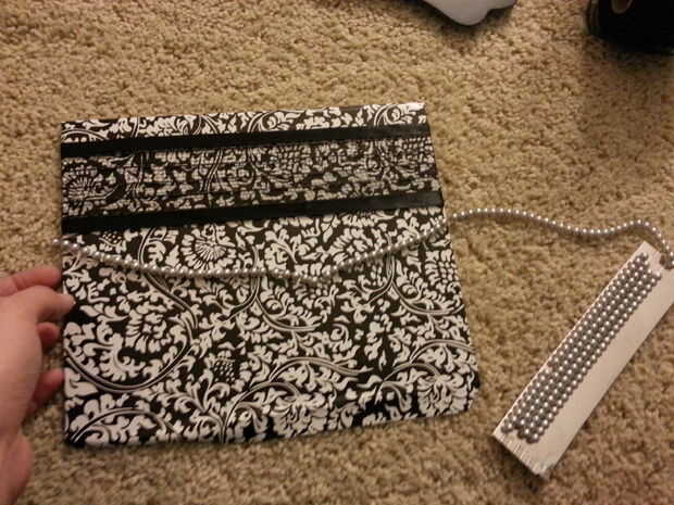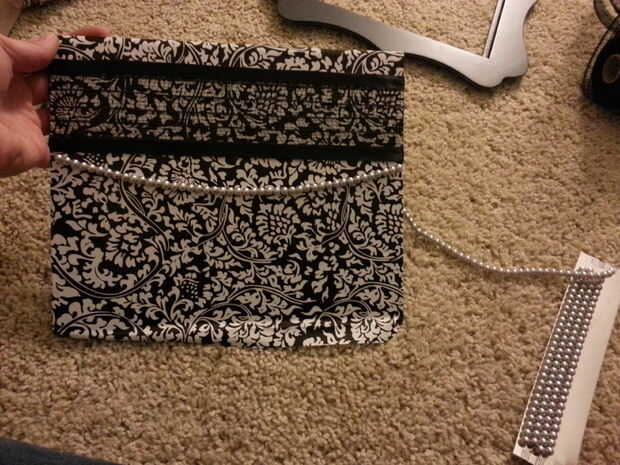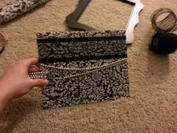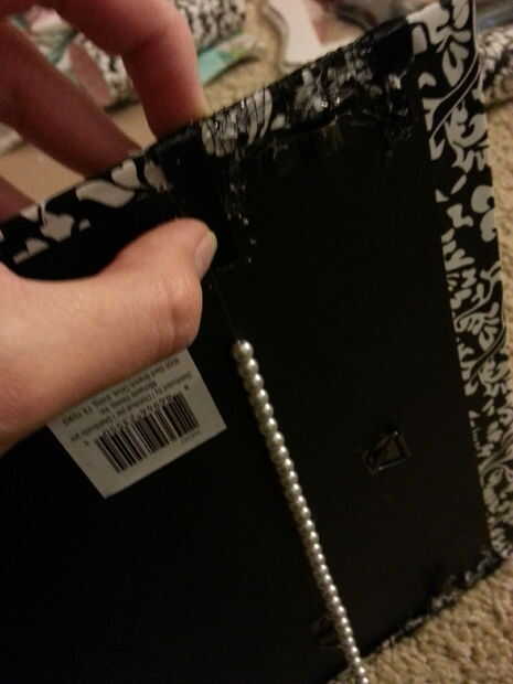 Mantienen las cuentas para ver cómo le gustaría a caer y el otro extremo del lado opuesto, en la parte posterior del pegamento. Prefiero hacer dos cadenas de perlas, pero usted puede hacer tantos o tan poco como quieras. Otra vez, asegúrese de dejar espacio para el marco en el borde. Cortar la cadena de bolas extra y ahorrar para otro proyecto.