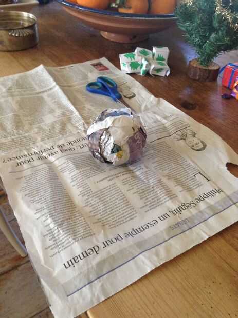 Hacemos una bola de papel con el papel de noticias. Usé unas cuatro hojas para la mina. Utilice la cinta para mantenerlo bonito y redondo. Debe ser del tamaño de una pelota de tenis.