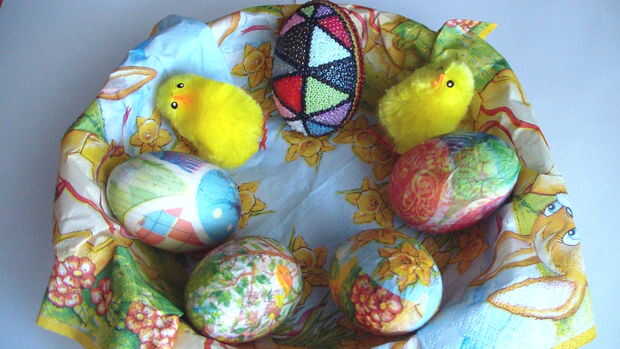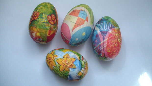 Me gustaría compartir mi idea de diseño de huevo de Pascua que implementé con éxito el año pasado. Usé la técnica de decoupage, es seguro para huevos duros si se utiliza la clara del huevo como un pegamento (funciona muy bien como un pegamento natura
