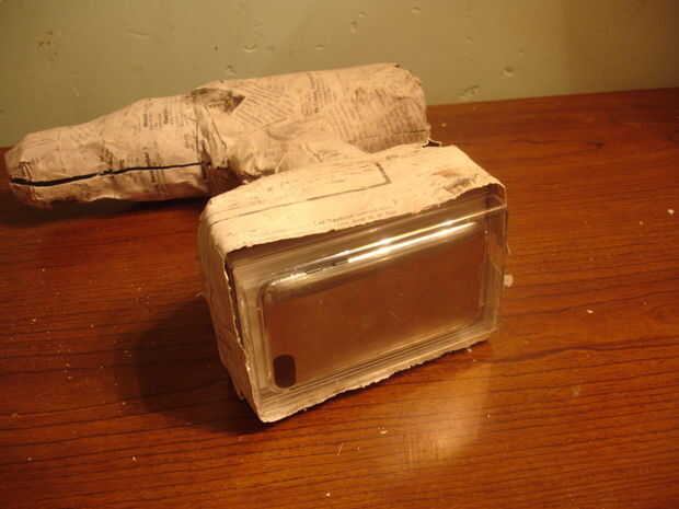 Después de poner las tiras de pegamento a lo largo de los soportes internos puse un pegote de pegamento en el parecer y extendido a lo largo con un pedazo de cartón, no tienes que hacerlo a lo largo de la entera parece justo en la zona, como la parte superior y lados de la parte inferior, selló los otros de la zona con tiras de cinta adhesiva. Luego me di cuenta de la parte inferior no estaba aún totalmente por lo que recortan lo un poco con unas tijeras, el iPod que encajan a la perfección solo usé unos toques de pegamento caliente para guardarlo de caer. Casi completo y allí del proyecto solo lo que queda que hacer... Terminando!