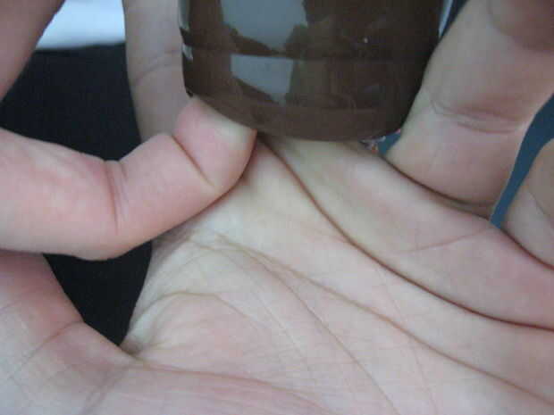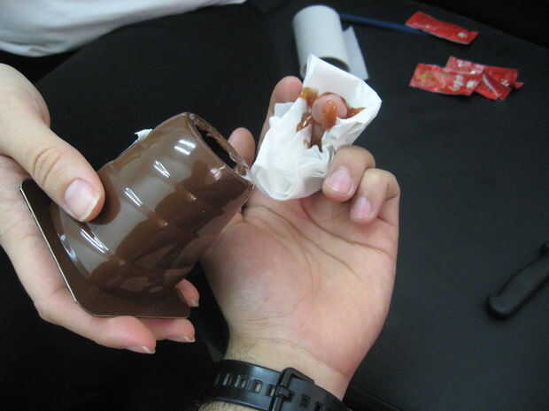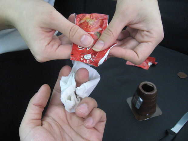 6. Vierta alguna salsa de tomate en el dedo y en el papel higiénico.