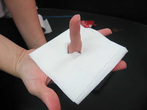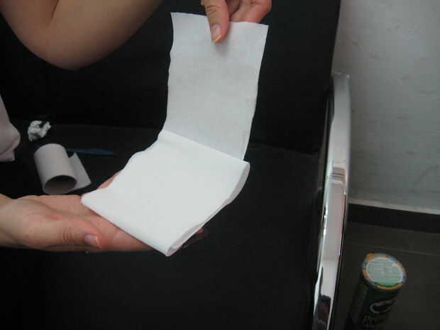 4. Tome el papel higiénico y corte un orificio en el centro (en el tamaño de su dedo).