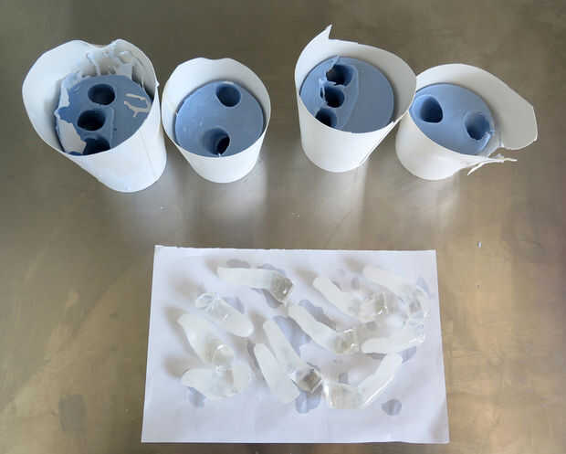 Ahora con el molde de alginato podemos lanzar nuestros dedos en un material más duradero. ¿Por qué necesitamos una versión más resistente de los dedos en lugar de utilizar directamente los dedos? Así que ha producir nuestros humanos carne no soporte un lote de materiales de fundición (tanto en términos de alergia de contacto y tiempo de curado) para tener una versión más duradera de nuestra voluntad de dedos sólo vienen en práctico.