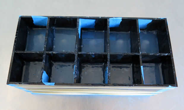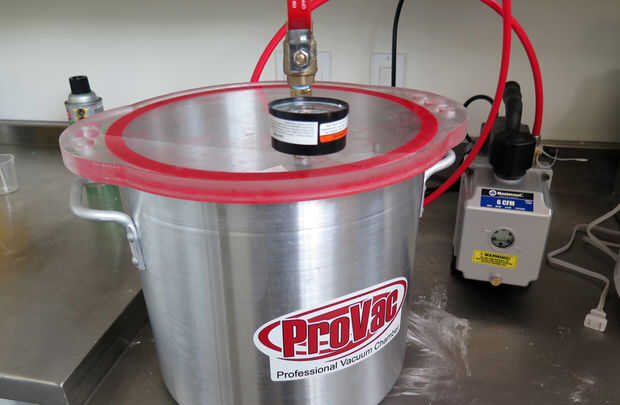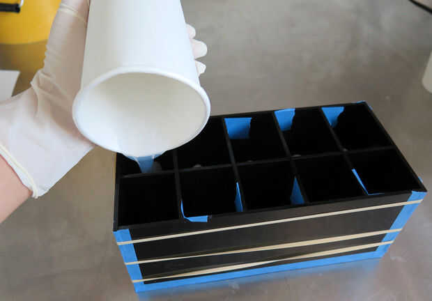 El material de silicona que utiliza es Smooth-on poco claro 40. alimento seguro y transparente que ayuda con la visibilidad de la fundición. Mezcla A y B según instrucciones y uso una cámara de vacío para desgasificar la mezcla de silicona. El resultado debe ser consistente y libre de burbujas. Vierta lentamente la mezcla de la silicona en la caja y si tiene las burbujas de aire en el proceso, siempre puede poner el cuadro entero en la cámara de vacío para desgasificación más.