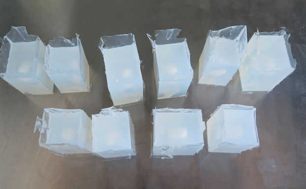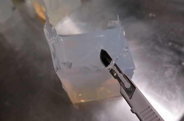 Sorta 40 claro lleva a cerca de 16 horas a curar en temperatura ambiente. Una vez curado, limpiar los bordes y cortar el molde abierto (no completamente) para obtener los dedos con un bisturí.