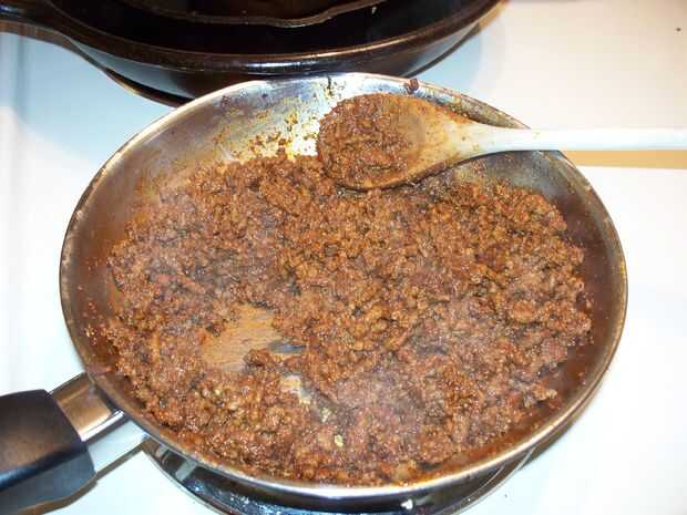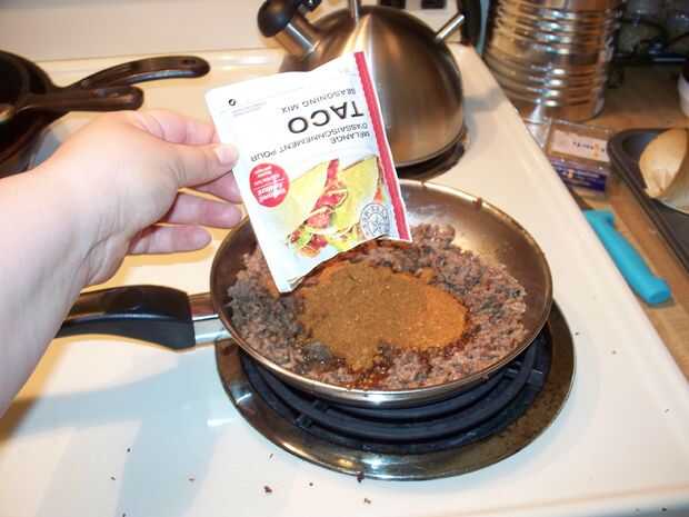 Cuando la carne se dore, escurrir la grasa. Mezcle según las instrucciones de sazonador de Taco. O, alternativamente, he tenido gran éxito con suficiente salsa de tomate para humedecer la carne y unos tragos de tu salsa favorita o escamas del Chile.