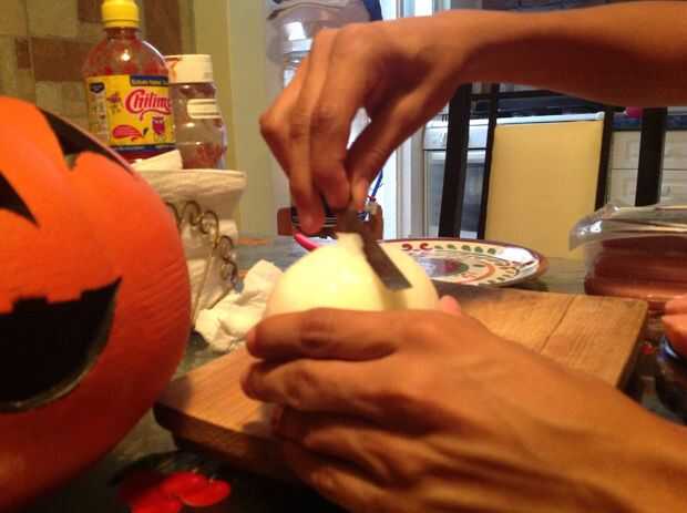 Tomamos la cebolla la cortamos en piernas, pequeñas o largas tiras (para dar la apariencia de uñas largas o cortas) y las colocamos en el corte hicimos a la salchicha anteriormente.