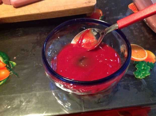 En el bote tenemos llenamos solo la base hasta se opaca el fondo, para darle el toque dulce se agrega una cucharada de chamoy y se revuelven hasta Charlotte un color rojo llamativo y lo vaciamos en el Platón. (yo escogí un plato un poco profundo, pero pueden usar el gusten)