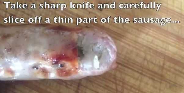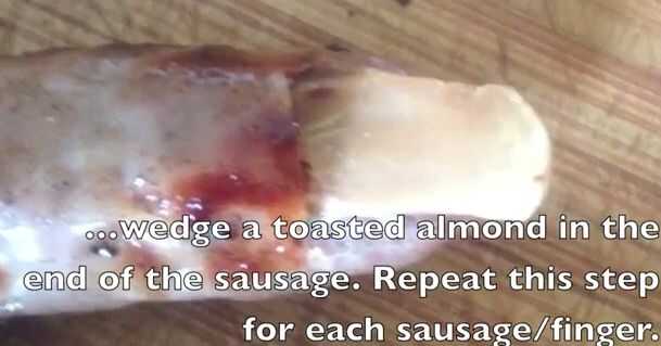 Corte una pequeña ranura de la punta de la salchicha y deslice la almendra rebanada en posición así que cava en las carnes expuestas en la parte posterior de la ranura y se asegura en lugar - también pegarlas en con salsa de tomate para un efecto aún más horripilante.