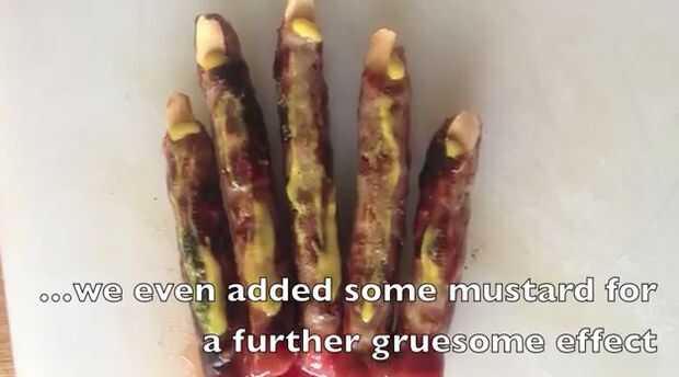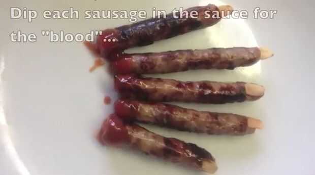 Cubrir el fondo de las salchichas en salsa roja para efecto de la sangre.