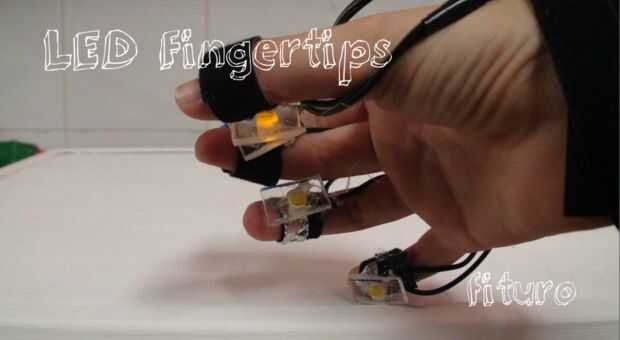 Es como un guante (pero sin guante) que tiene LEDs en los dedos y al tocar algo con la yema del dedo el LED se enciende. Hice mi propia versión y es muy fresco y te recomiendo hacerlo por diversión.