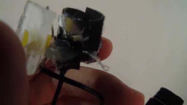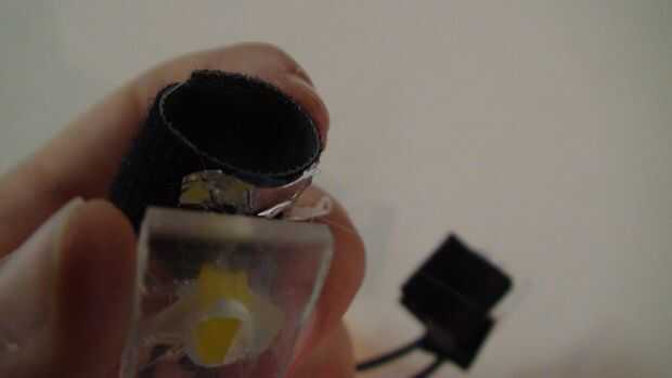 Medir el alcance de la mano en el acrílico y con la dremel cortar los cinco pedazos, uno para cada dedo. Después de eso hacer un agujero en el centro y poner el LED en. Pegar con la pistola de pegamento caliente. Luego doblar las piernas negativo del LED y el positivo. Repetir el proceso cinco veces.
