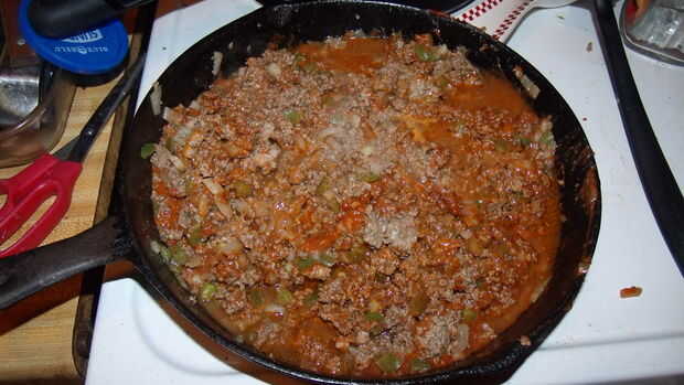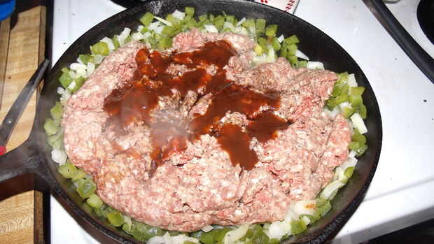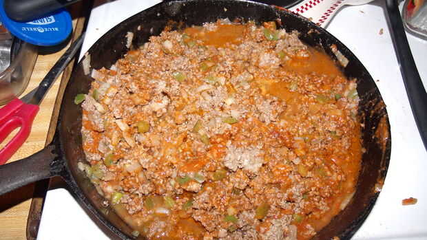 calentar la sartén, añadir las cebollas, pimientos y carne picada, sal y pimienta a gusto, me gusta añadir carne y worcheshire salsas durante la cocción, dorar y drenar la mezcla de carne y luego añadir en el condimento para tacos, pueden de tomate sopa y cualquier otro condimento que te deseo, revolver y cocer a fuego lento de 10 minutos
