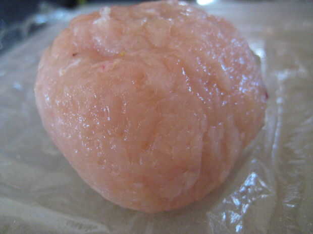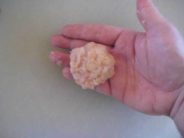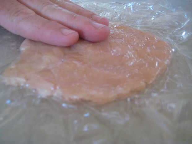 3. Coloque una cantidad "tamaño de pelota de golf" de carne de pollo en la envoltura de plástico, luego doblar el plástico sobre la