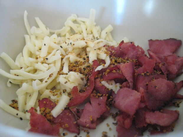 4. en un bol pequeño, colocar 1/4 taza de queso, 2 cucharadas de tocino, un salpicadero o ajo, albahaca y limón, pimienta