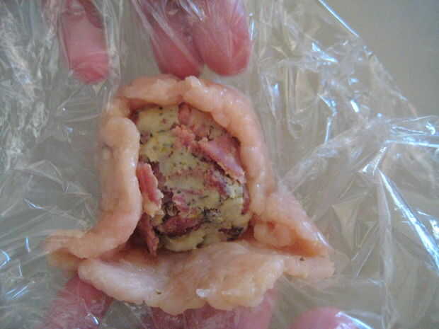 6. Utilice la envoltura plástica para doblar la carne de pollo alrededor de la bola de queso, a continuación, presione la carne de pollo