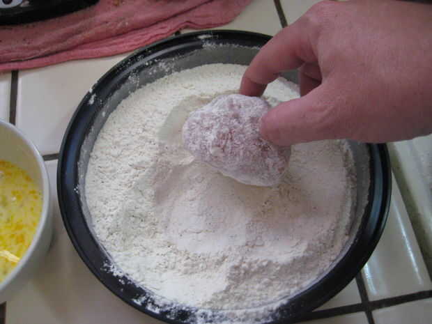 4. Coloque bolas de pollo en la mezcla de harina para un abrigo ligero.