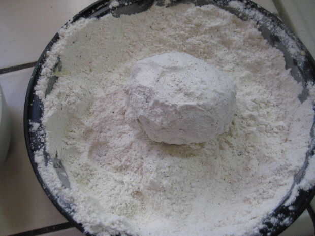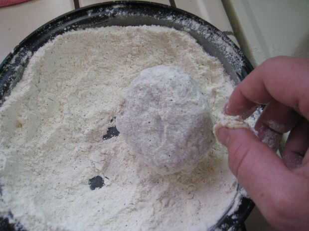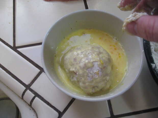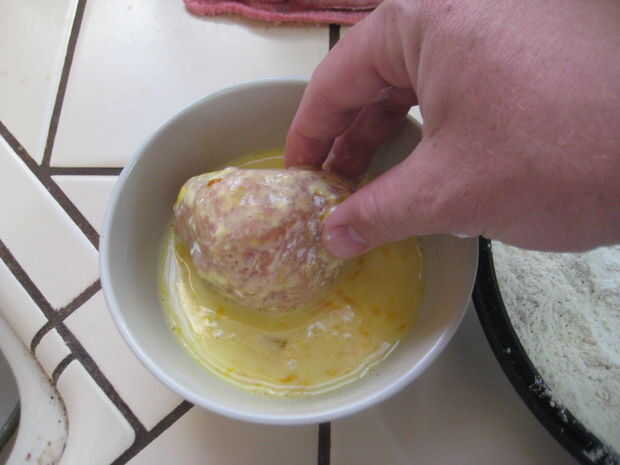 6. Coloque el huevo bola recubierta en harina mezclar otra vez y cubrir completamente.