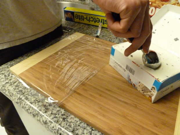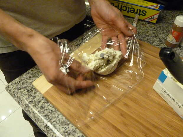 Para empezar, quiere sacar una cucharada grande de crema de hielo en un pedazo de abrigo de saran. El abrigo de saran limpio evita que las manos la bondad cremosa. Asegúrese de que embalarlo muy densa por lo que cuando entra en la freidora, el centro se queda frío.
