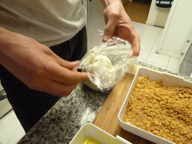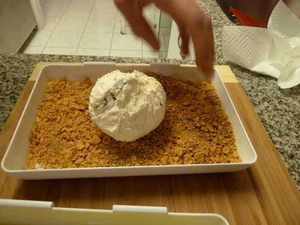 Sacar la bola de helado del congelador y desenvuelva. Entonces usted quiere rodar alrededor en la mezcla de cornflake y cubrir uniformemente.