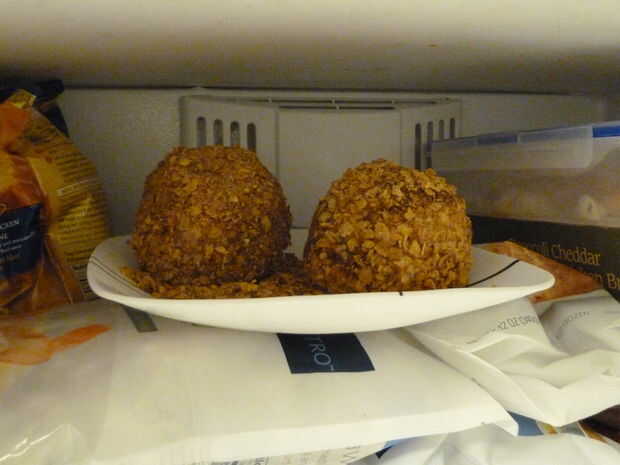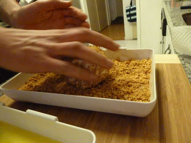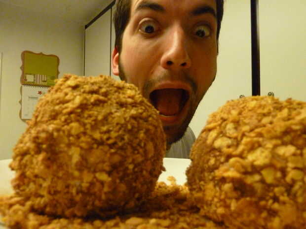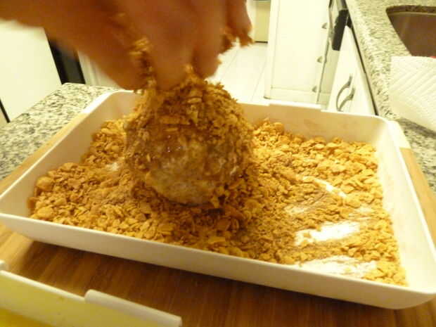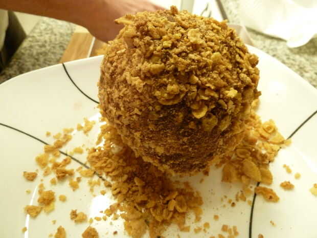 Nota: Si usted tiene una bola de helado tamaño gigante de baloncesto como mi muchacho Craig aquí, insto a que repita el huevo/cornflake que sumerge un par de veces más a la proporción de corteza al helado.