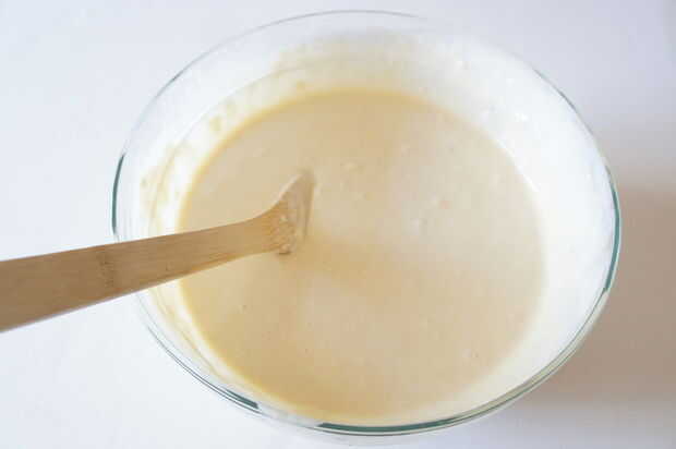 Batir los huevos y la leche. Luego agregue los otros ingredientes. La masa debe ser suave, pero aún puede tener pequeños bultos.