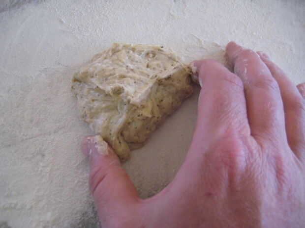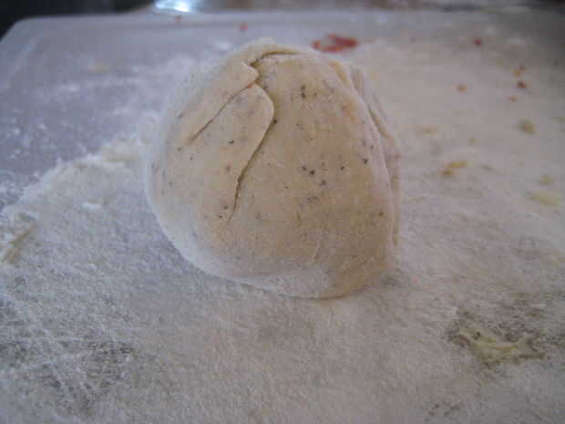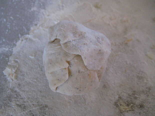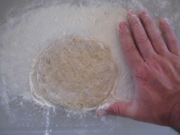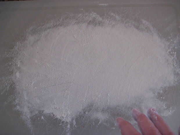 2. con las manos enharinadas, tomar una cantidad "tamaño de pelota de golf" de masa y aplanar es alrededor de 1/8 pulgada de espesor.