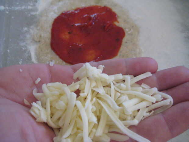3. Unte 1 cucharada más o menos de salsa para pizza en el centro de la masa. Asegúrese de dejar un borde de