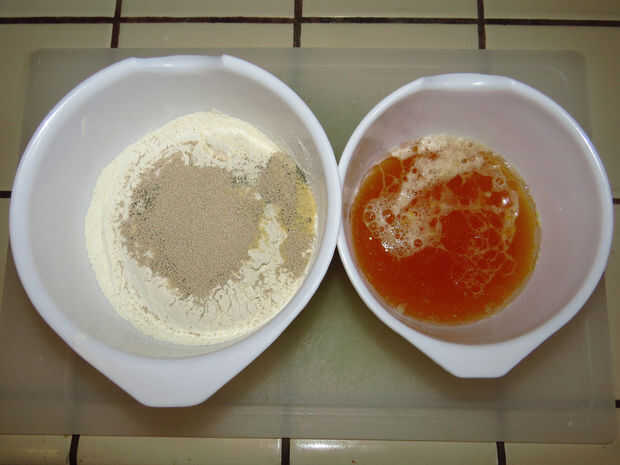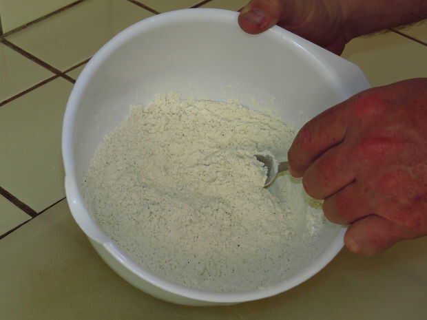 1. en un tazón grande, mezclar la harina, levadura, azúcar, sal y condimentos