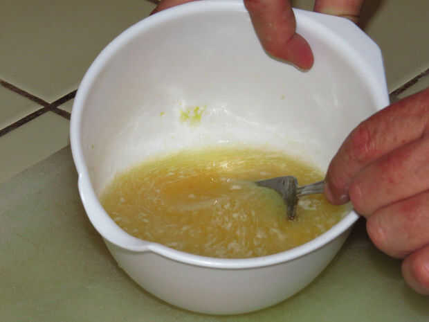 2. en un recipiente aparte, mezclar el huevo, cerveza y aceite licuado