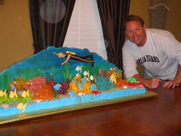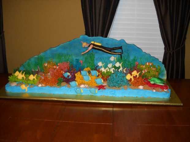 La parte azul del fondo del mar es pastel cubierto de crema azul con acentos de gel de tubo azul. Además de eso es azúcar morena arena y los arrecifes de coral multicoloras.
