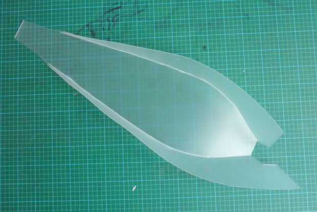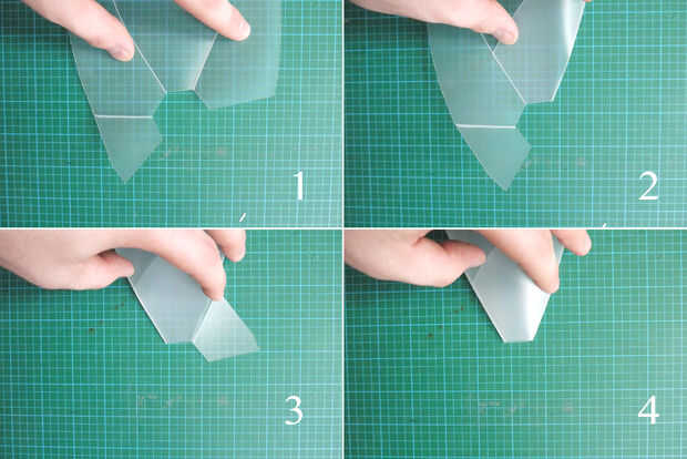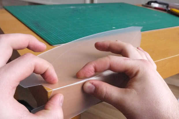 2 - en el lado de una mesa, doblar el plástico siguiendo las marcas. Puede hacer esto al principio y luego empieza a poner más presión por doblar las manos.