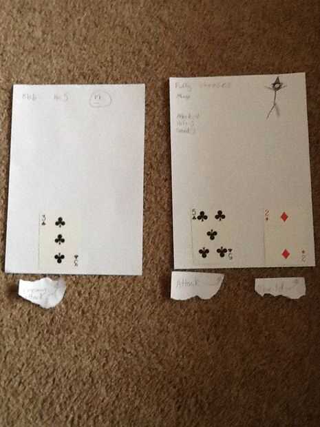 En una batalla que elabore una tarjeta enemigo sobre papel, con su nombre y salud a empezar dibujar dos tarjetas el primero dibujaras de la cubierta es el daño (veces que por ataca puntos) al enemigo, la otra tarjeta es tu escudo. entonces el maestro tarjeta dibuja una tarjeta (para el enemigo) si no está muerto. es el ataque enemigo, si el enemigo dibuja un 3 y tu escudo es 2, su tarjeta de escudo deja 2 daño del ataque y se golpeó para 1 punto de daño! su salud es su defensa. Si usted está a punto de morir saque una tarjeta y veces por su velocidad si usted consigue 15 o más usted puede funcionar después de haber hecho este repetir desde el principio hasta el enemigo o muere.