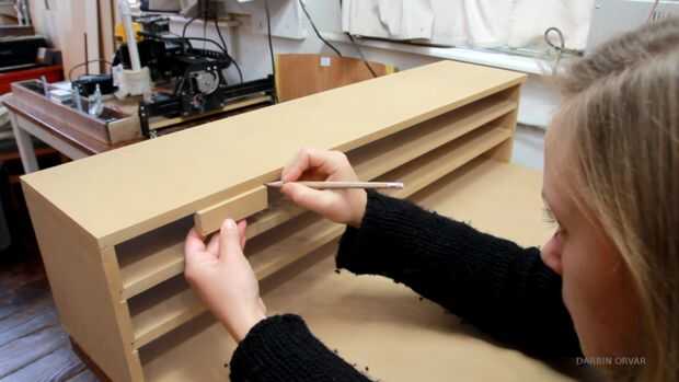 Siguiente paso es marcar donde necesito utilizar el router para hacer ranuras para añadir 1/4 de pulgada MDF para hacer los cubbies. Tengo un pedazo que actúan como una plantilla para que sea más fácil. Luego dibujo las líneas abajo de la pieza.