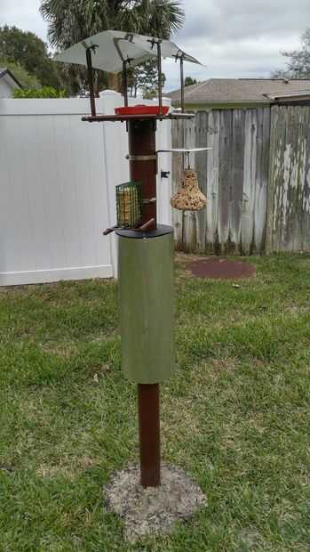 Una manera rápida, fácil y relativamente barata para burlar a las ardillas de llegar a su comedero. Lo que usted necesita: algún tipo de poste (yo usé el cayado de un pastor), un deflector de cúpula (bastante barato en Lowes o Home Depot) y una abraz